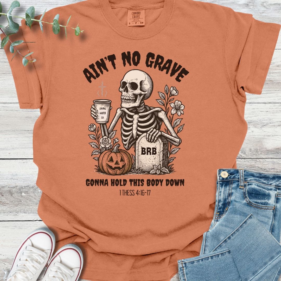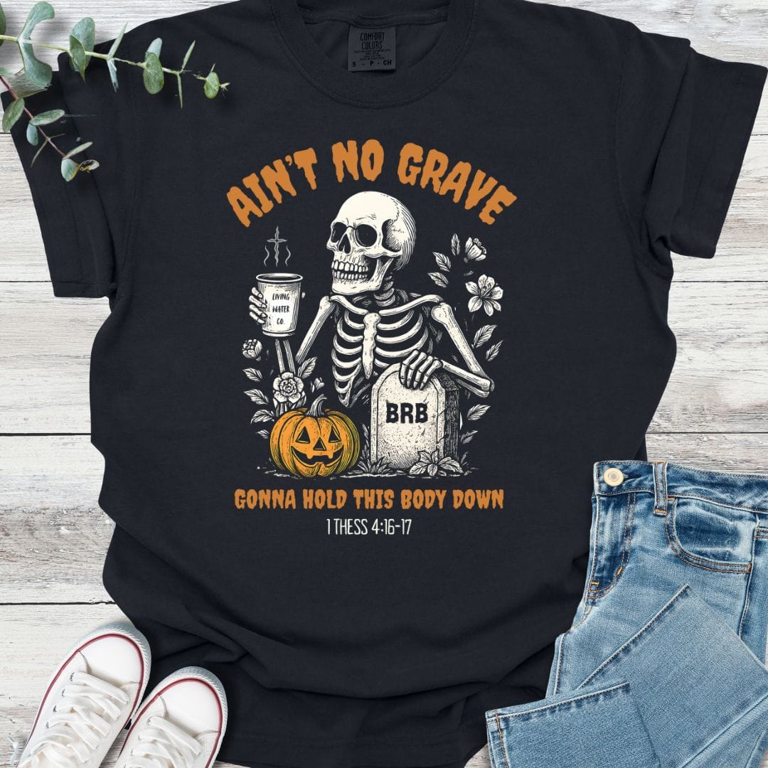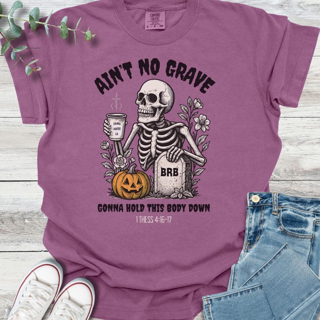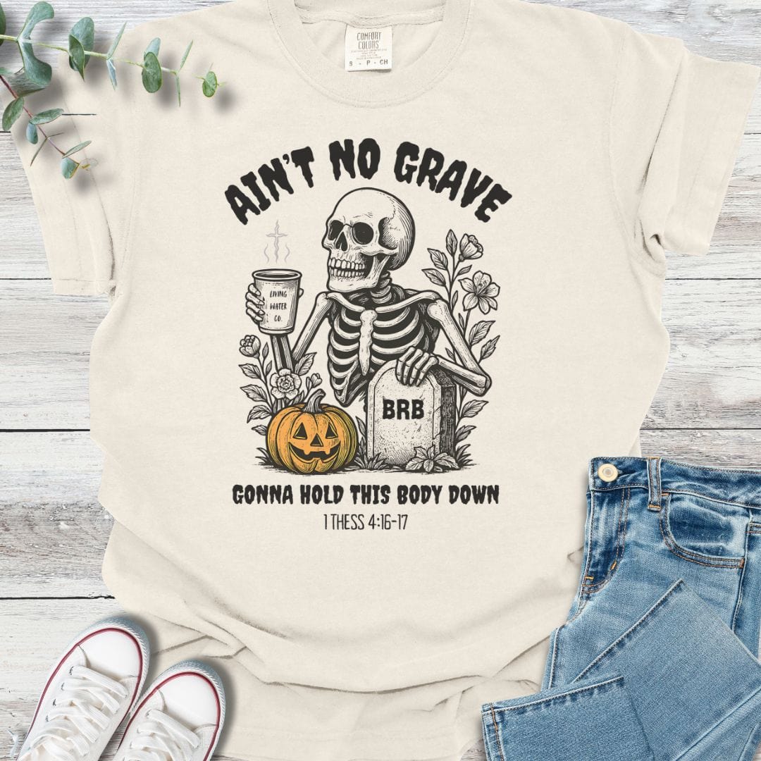 This Comfort Colors tee puts resurrection hope front and center with a bold, tongue-in-cheek twist. Inspired by 1 Thessalonians 4:16-17, it carries the message that no grave can hold us down in Christ—reminding us of eternal life and victory over death.
