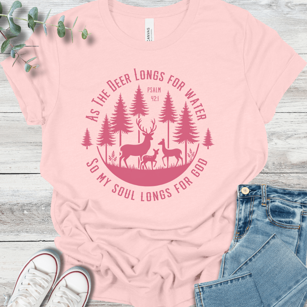 This Bella + Canvas t-shirt features Psalm 42:1: "As the deer longs for the water brooks, so my soul longs for You, God." With a serene forest and deer graphic, this monochrome design is perfect for the nature lover seeking a daily reminder of their soul’s deep desire for God’s presence.