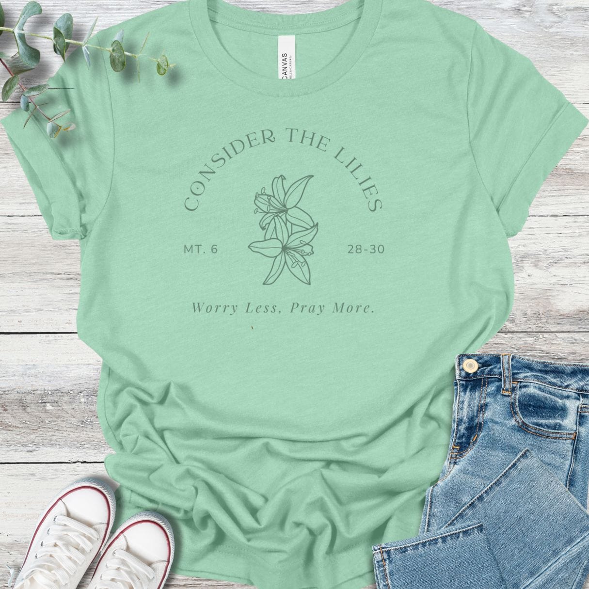 Printed on a soft Bella+Canvas tee, this design reflects Jesus’ words from Matthew 6:28–30, reminding us to rest in God’s provision. “Consider the lilies” is more than a phrase—it’s a call to let prayer replace worry. Wear it as a daily reminder that the God who clothes the flowers of the field will also care for you.