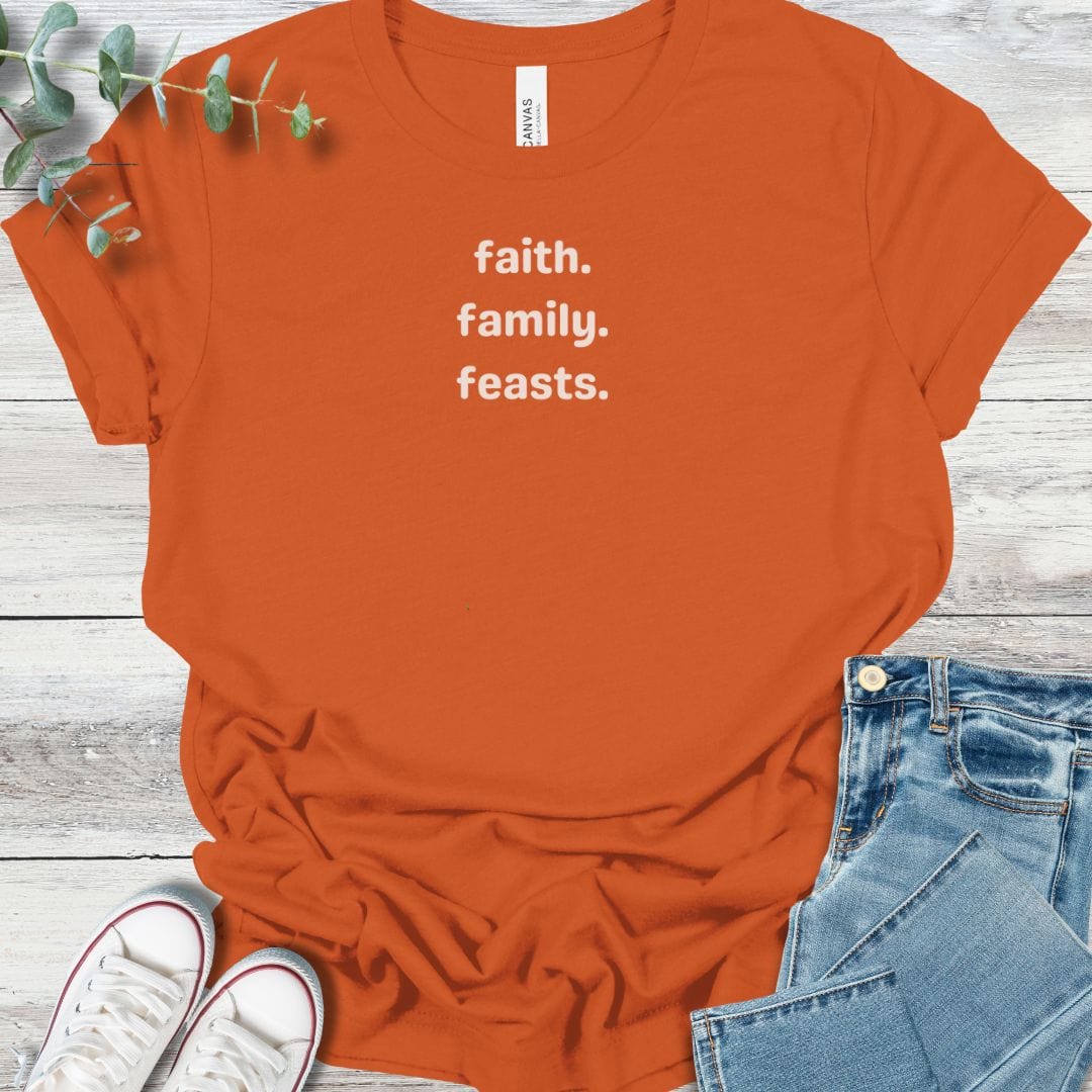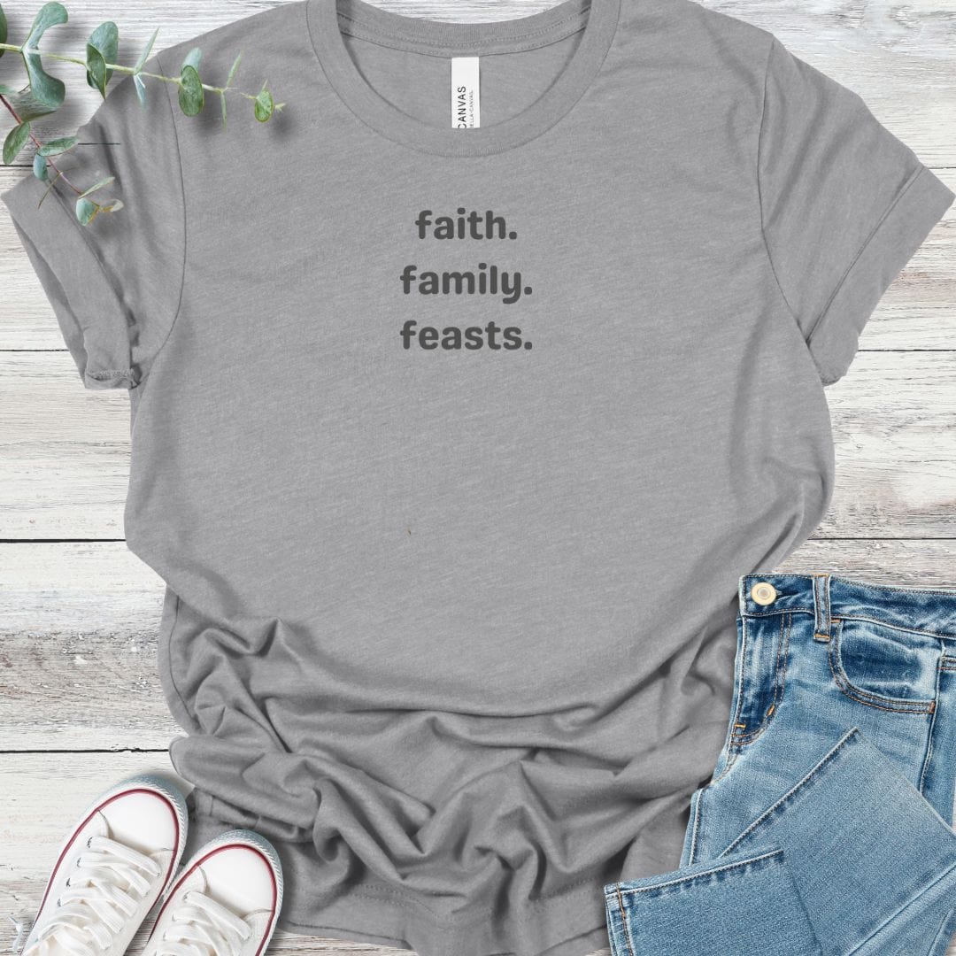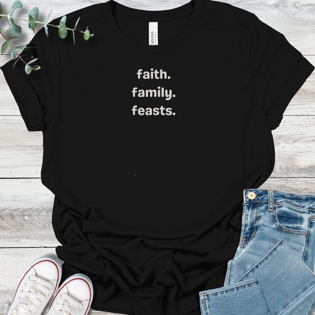 This tee highlights the trio that makes the season memorable—faith, family, and feasts. Made with premium Bella+Canvas quality, it’s a simple yet meaningful design that speaks to gratitude and togetherness while keeping faith at the center.