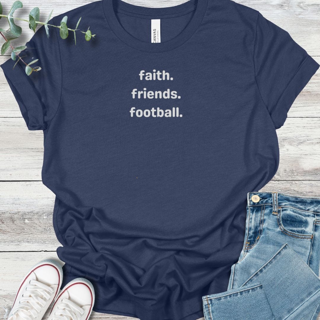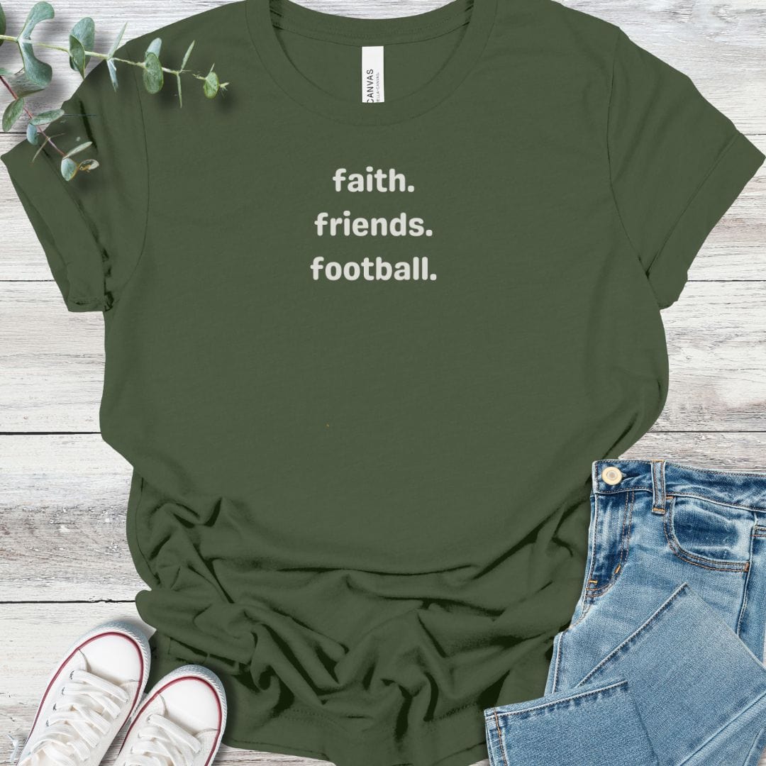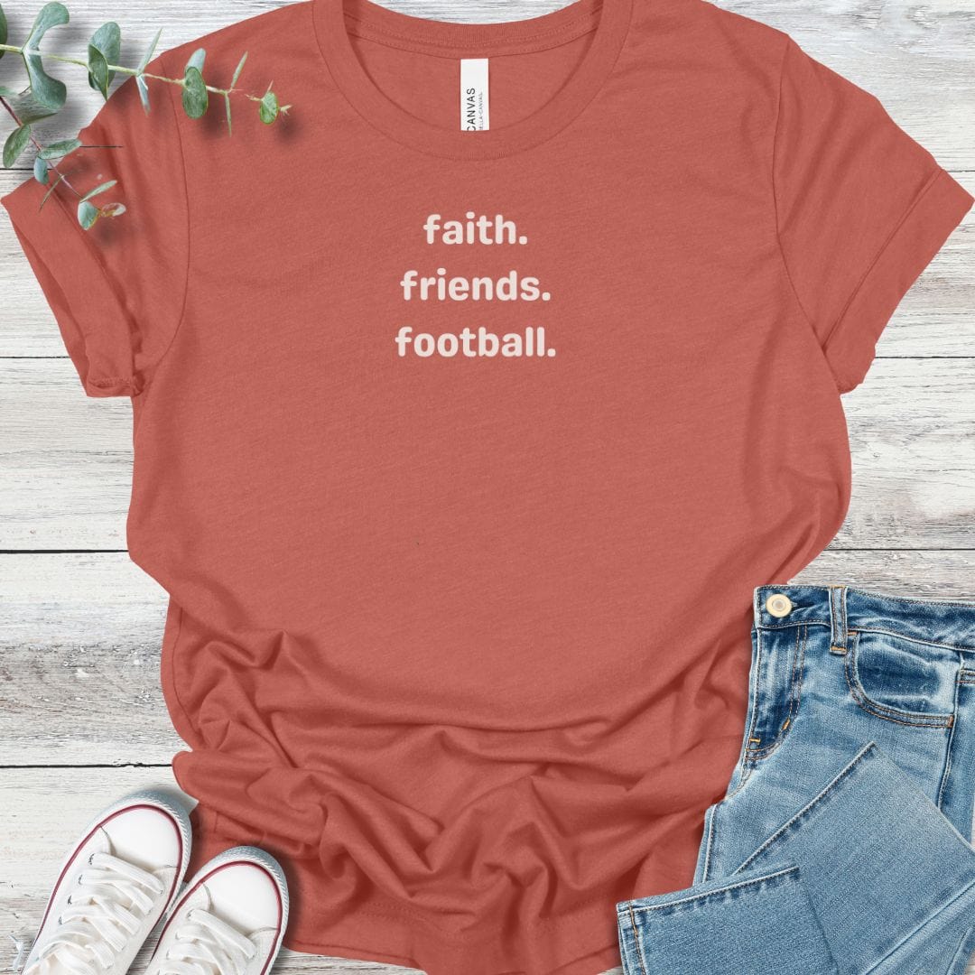 Printed on a Bella+Canvas tee, this design celebrates three weekend favorites—faith, friendship, and football. It’s a simple, laid-back statement that ties community and game day together while holding faith above all.