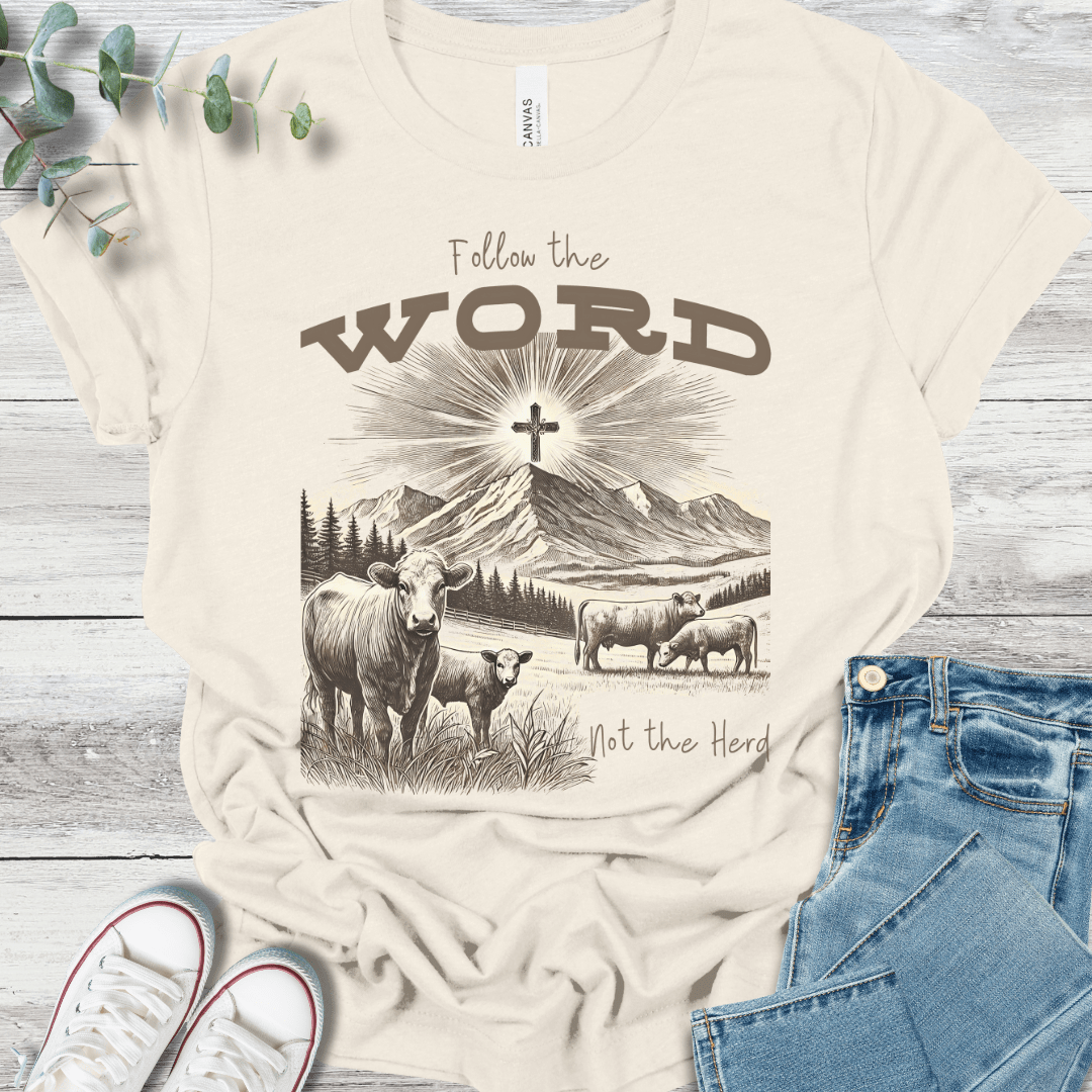 Make a bold statement of faith with this "Follow the Word, Not the Herd" design, printed on the soft and high-quality Bella + Canvas 3001 t-shirt. Featuring a western-inspired sketch and a radiant cross, it serves as a powerful reminder to follow Christ over the crowd.