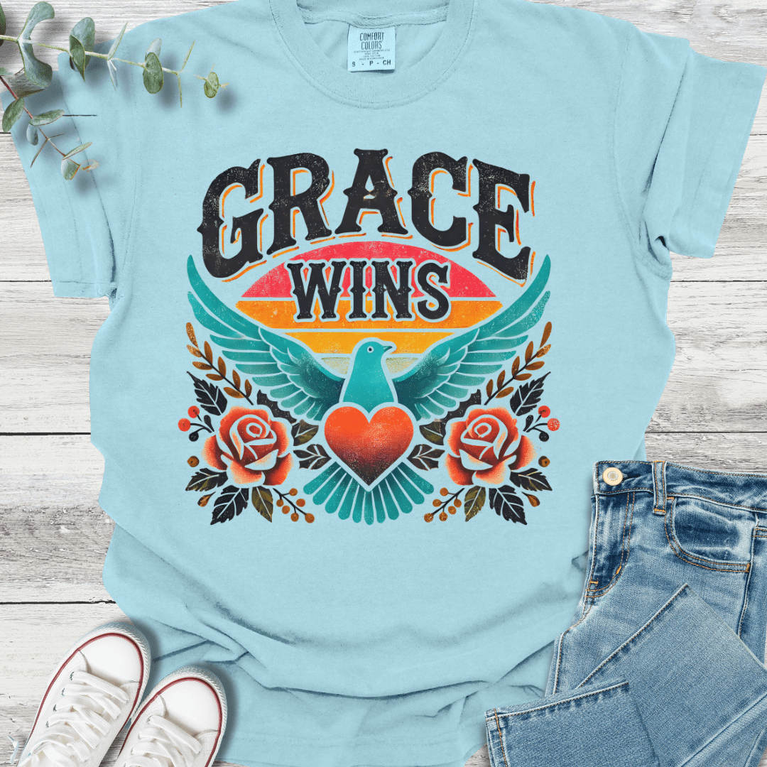 Celebrate the victory of grace with this bold 'Grace Wins' design, printed on the premium Comfort Colors 1717 t-shirt. Featuring a retro-inspired dove and heart graphic with vibrant colors and floral accents, this design reminds us that no matter the challenge, God's grace always triumphs.