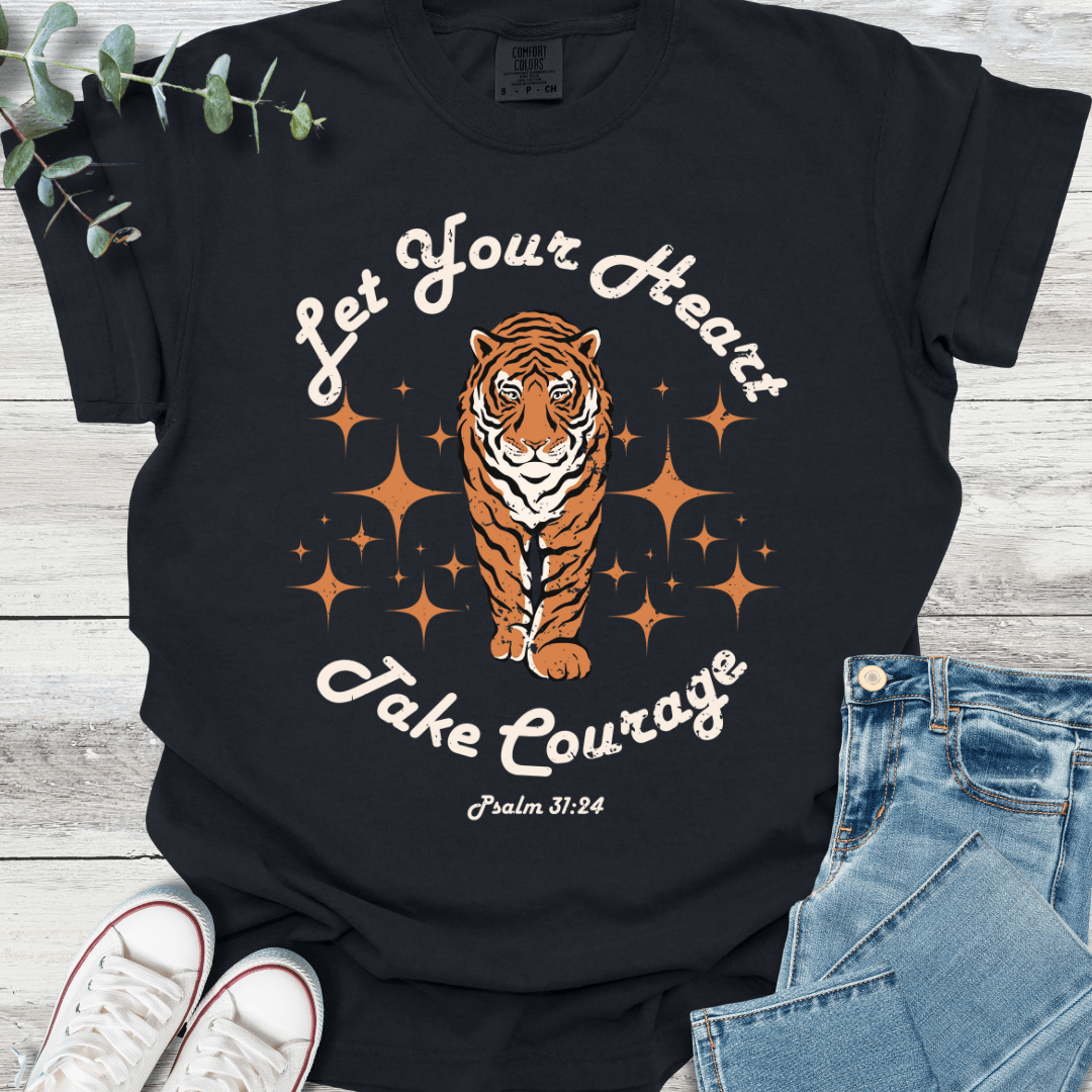 "Let Your Heart Take Courage" with this bold t-shirt, featuring a fierce tiger and cosmic backdrop. Inspired by Psalm 31:24, this design reminds you to face life’s challenges with confidence, trusting in God's strength. Crafted with the soft, vintage comfort of Comfort Colors 1717, it’s the perfect blend of style and faith for those ready to live courageously.