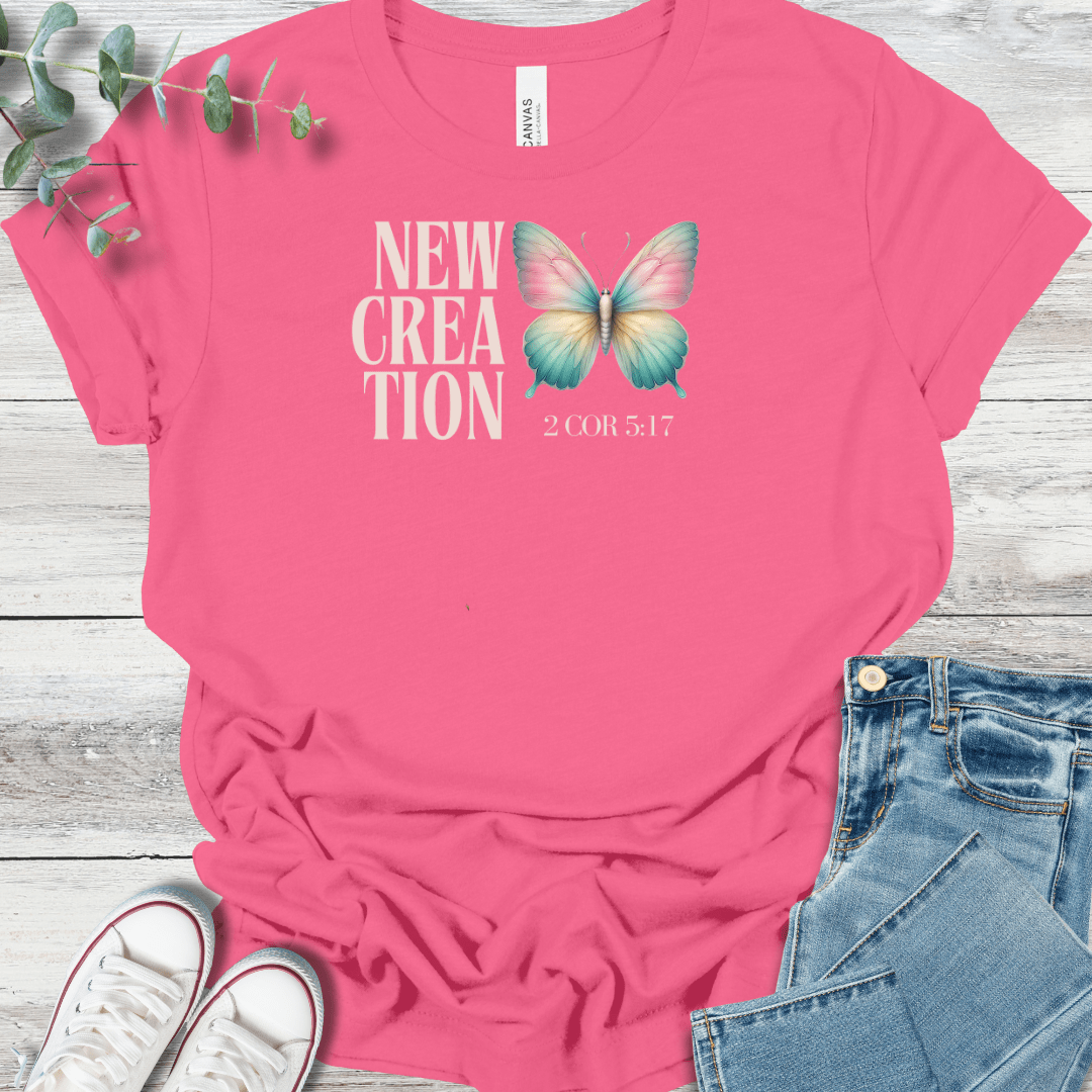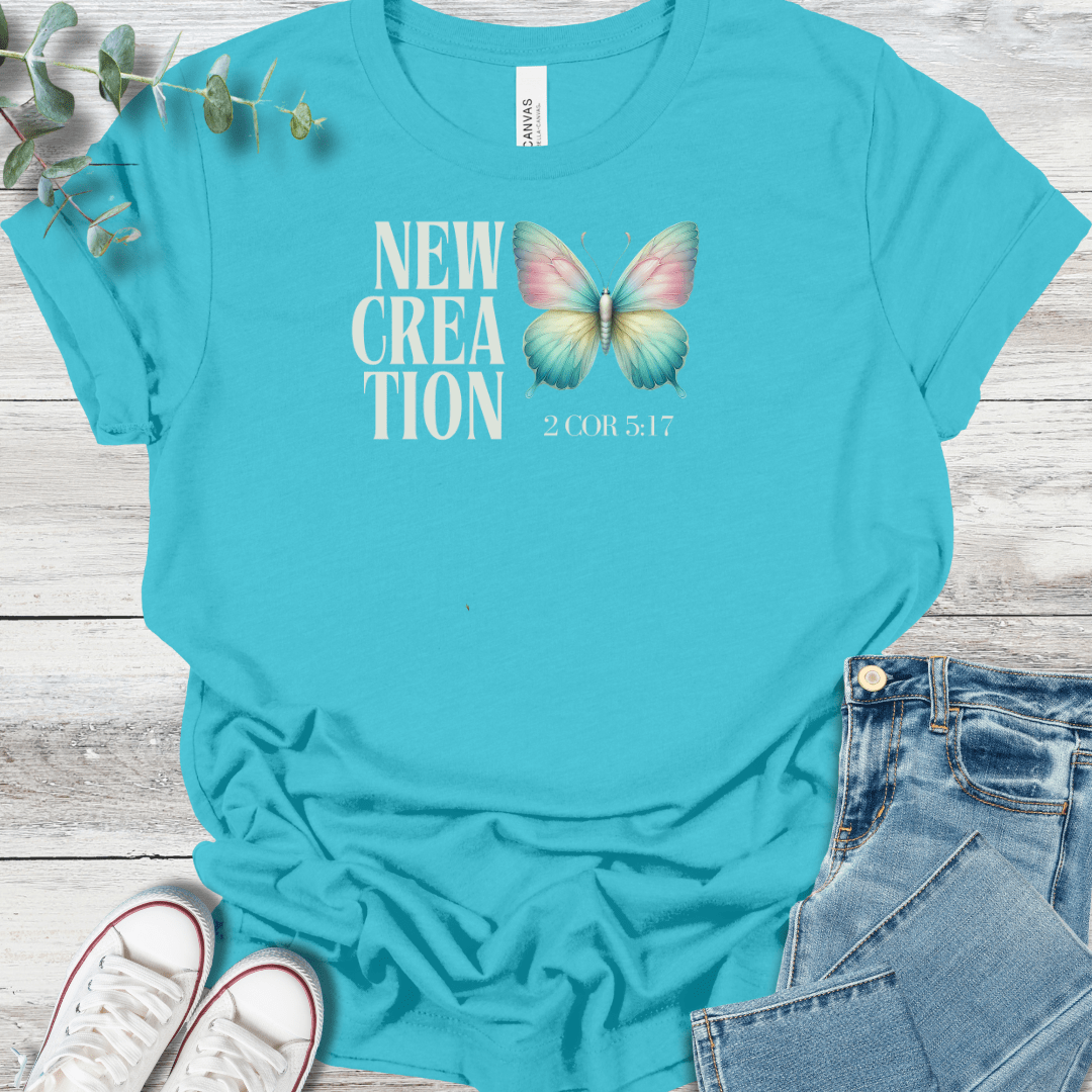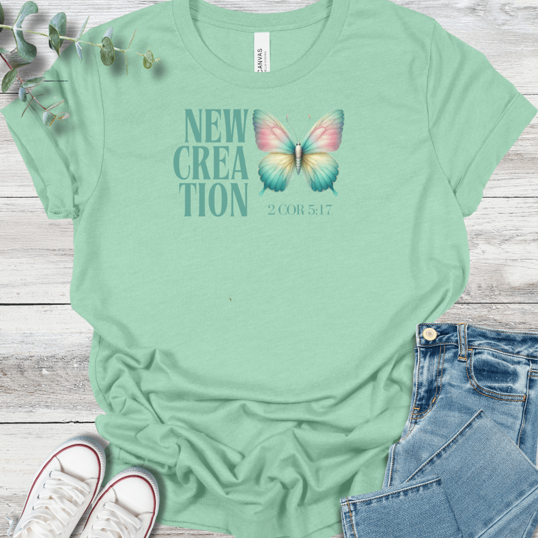 Inspired by 2 Corinthians 5:17, this design is a reminder that in Christ, we are made new—"If anyone is in Christ, he is a new creation; the old has gone, the new is here!" The butterfly represents renewal and growth, a symbol of God’s grace at work in our lives. Printed on a Bella + Canvas 3001 tee, it's a faith-filled piece you’ll want to reach for again and again.