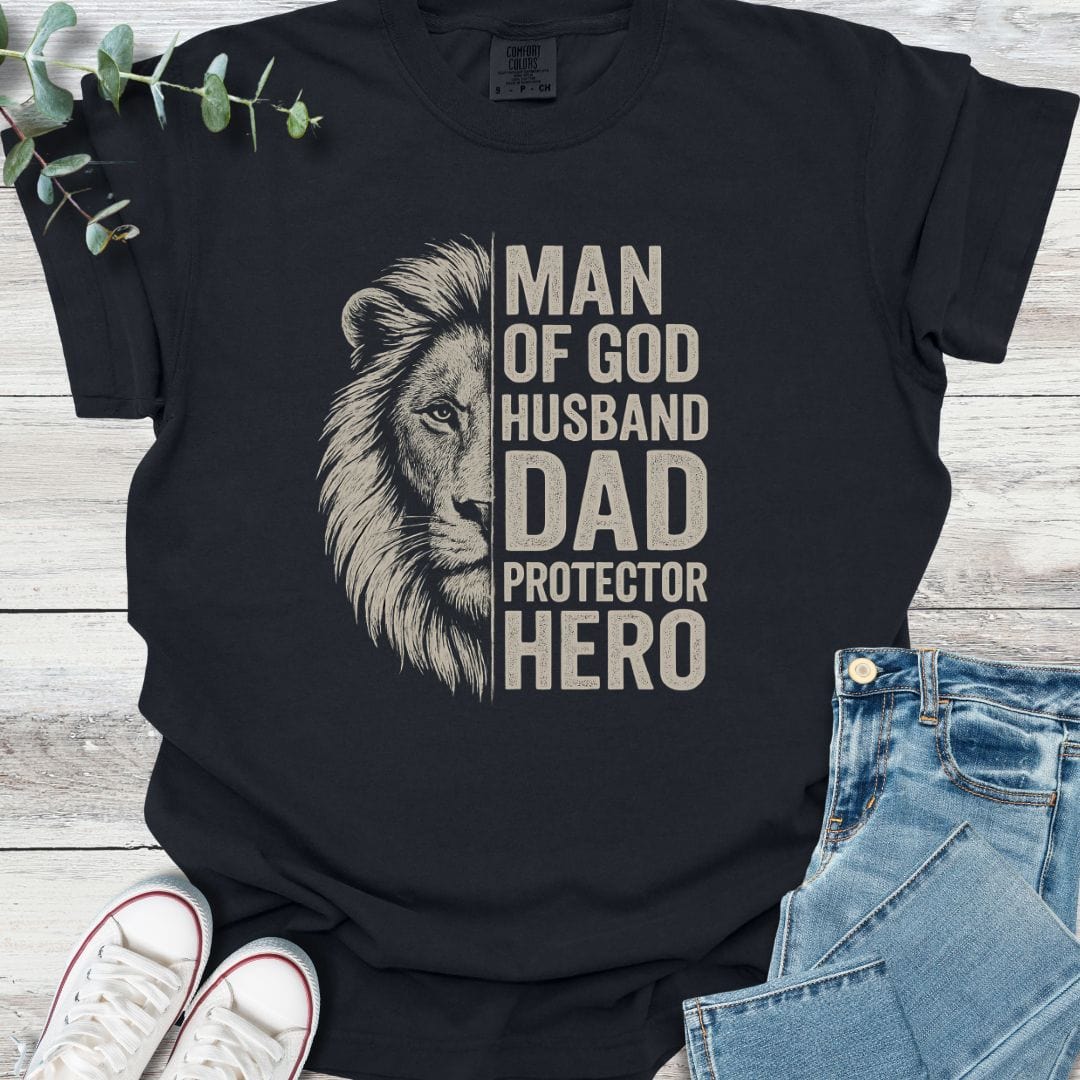 For the man who wears every title with strength—Man of God, Husband, Dad, Protector, Hero. This Comfort Colors tee is a bold Father’s Day tribute to the kind of courage that doesn't just show up—it stands firm in faith. Designed to honor the everyday heroes raising the next generation.