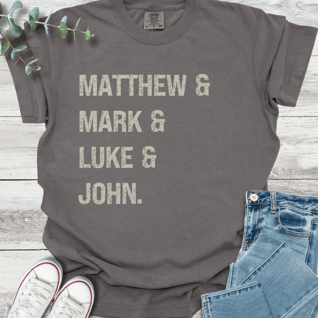 Celebrate the Gospels with this bold "Matthew, Mark, Luke & John" t-shirt. Featuring the names of the four Gospel writers in a rugged, minimalist design, this tee is perfect for those who love diving into the Word and sharing the Good News. Made with the soft, vintage feel of Comfort Colors 1717, it’s ideal for anyone who wants to rep the foundational truths of the New Testament.