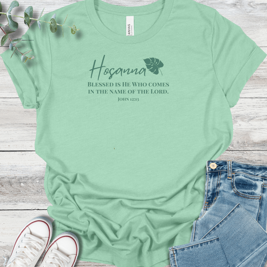 Inspired by John 12:13, this Bella+Canvas 3001 t-shirt reflects Christ’s triumphal entry—"Blessed is He who comes in the name of the Lord." A meaningful design for Palm Sunday, Easter, and everyday worship, reminding us to lift our praises high.