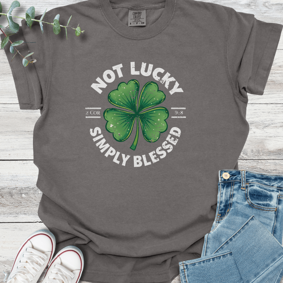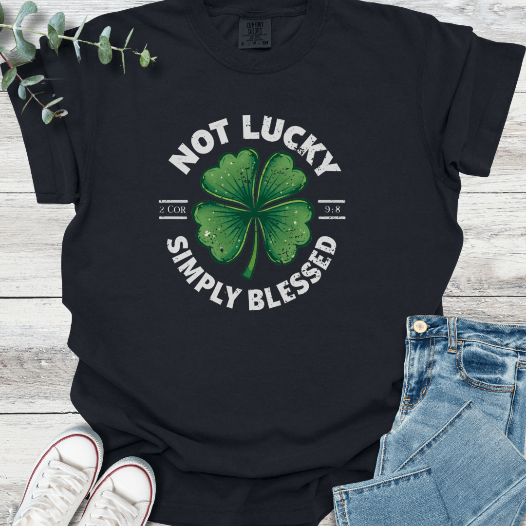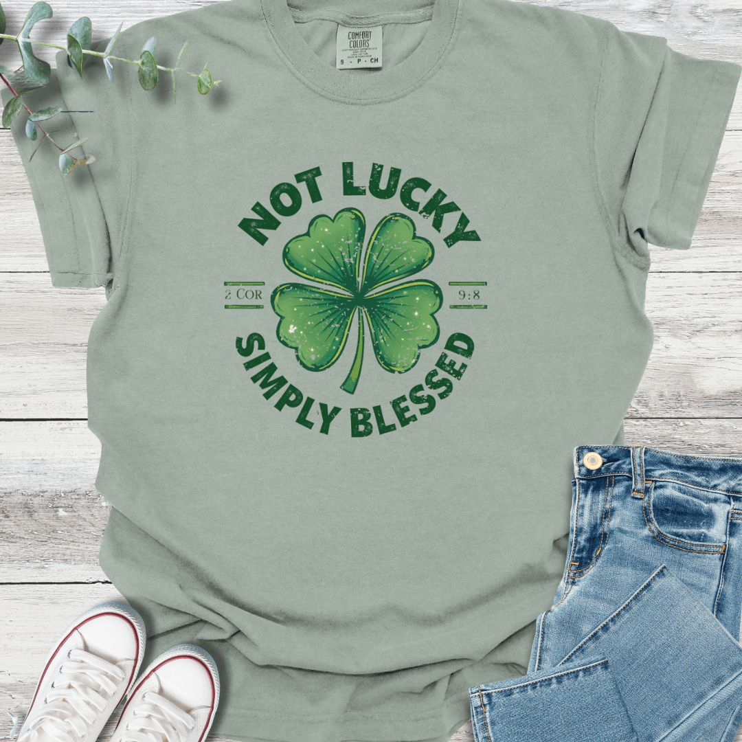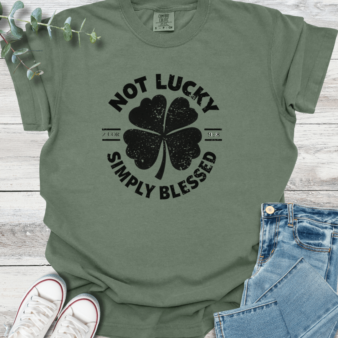 Celebrate the blessings in your life with this Comfort Colors tee featuring a distressed 'Not Lucky, Simply Blessed' design. Centered around 2 Corinthians 9:8, 'And God is able to bless you abundantly, so that in all things at all times, having all that you need, you will abound in every good work,' this shirt is a perfect reminder that God's grace is all we need.