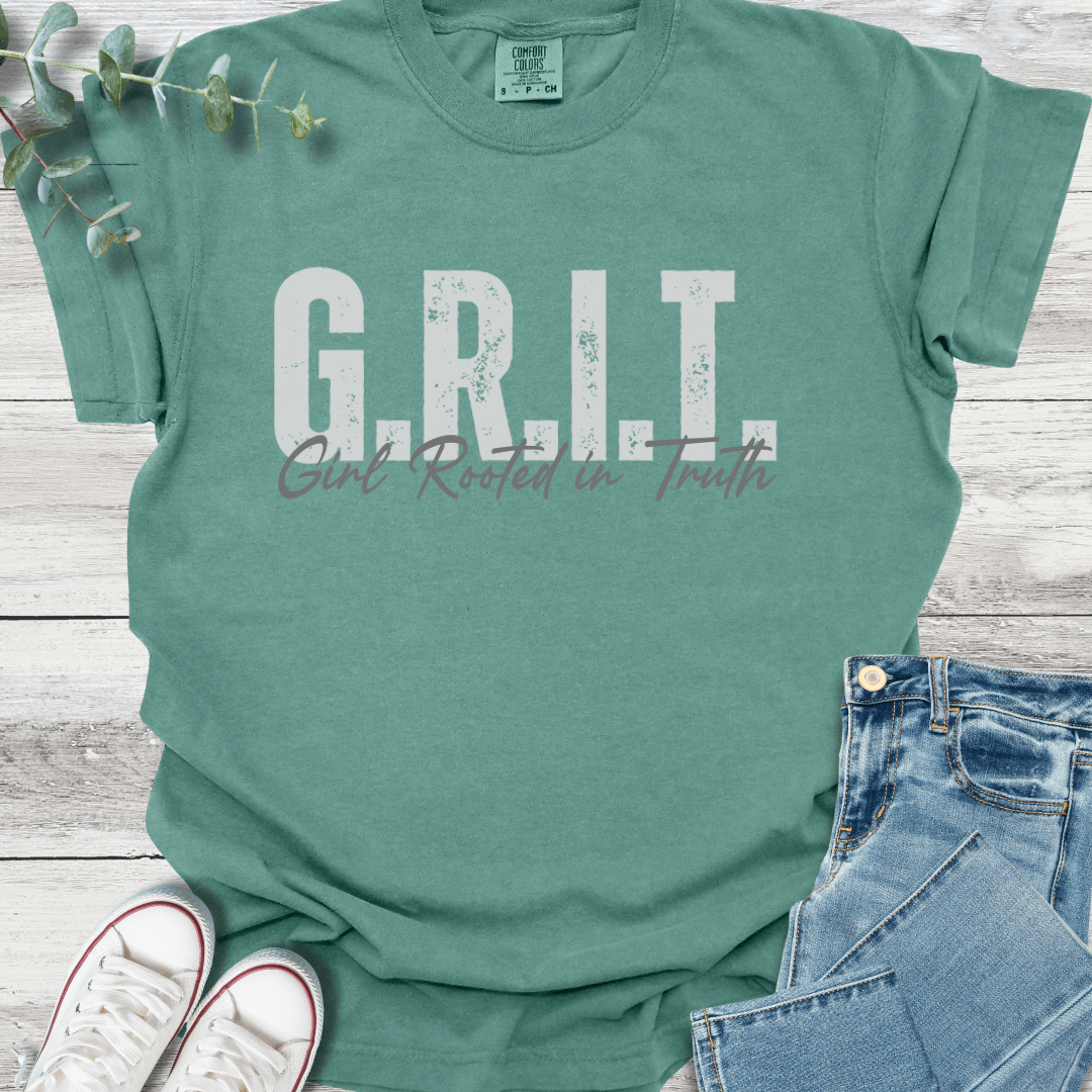 Show your grit, Girl! This 'G.R.I.T.' design, standing for 'Girl Rooted in Truth,' is printed on the premium Comfort Colors 1717 t-shirt. With a bold, distressed look, this shirt reminds you that true grit comes from being firmly grounded in God's truth, empowering you to face any challenge with faith and confidence.